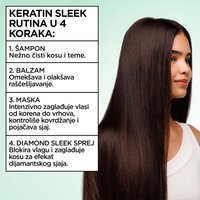 KERATIN SLEEK - Naša napredna tehnologija dugotrajno zaglađuje neposlušnu kosu i daje joj sjaj. Formula obogaćena sa 4% zaglađujućeg kompleksa i uljem argana, za kosu koja je do 93% sjajnija.1 Naneti na mokru kosu, zatim isprati. U slučaju kontakta sa očima, odmah ih temeljno isperite. 1 Instrumentalni test šampon + balzam.